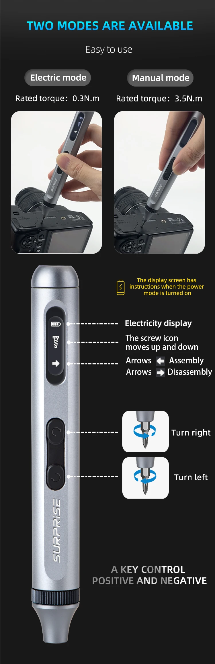 Com torque elétrico de 0,35Nm e manual de até 3,5Nm, o Surprise Precision Pro™ entrega desempenho de alto nível em qualquer situação. É a ferramenta perfeita para quem busca precisão cirúrgica e resultados rápidos — seja para manutenção profissional ou pequenos reparos em casa.