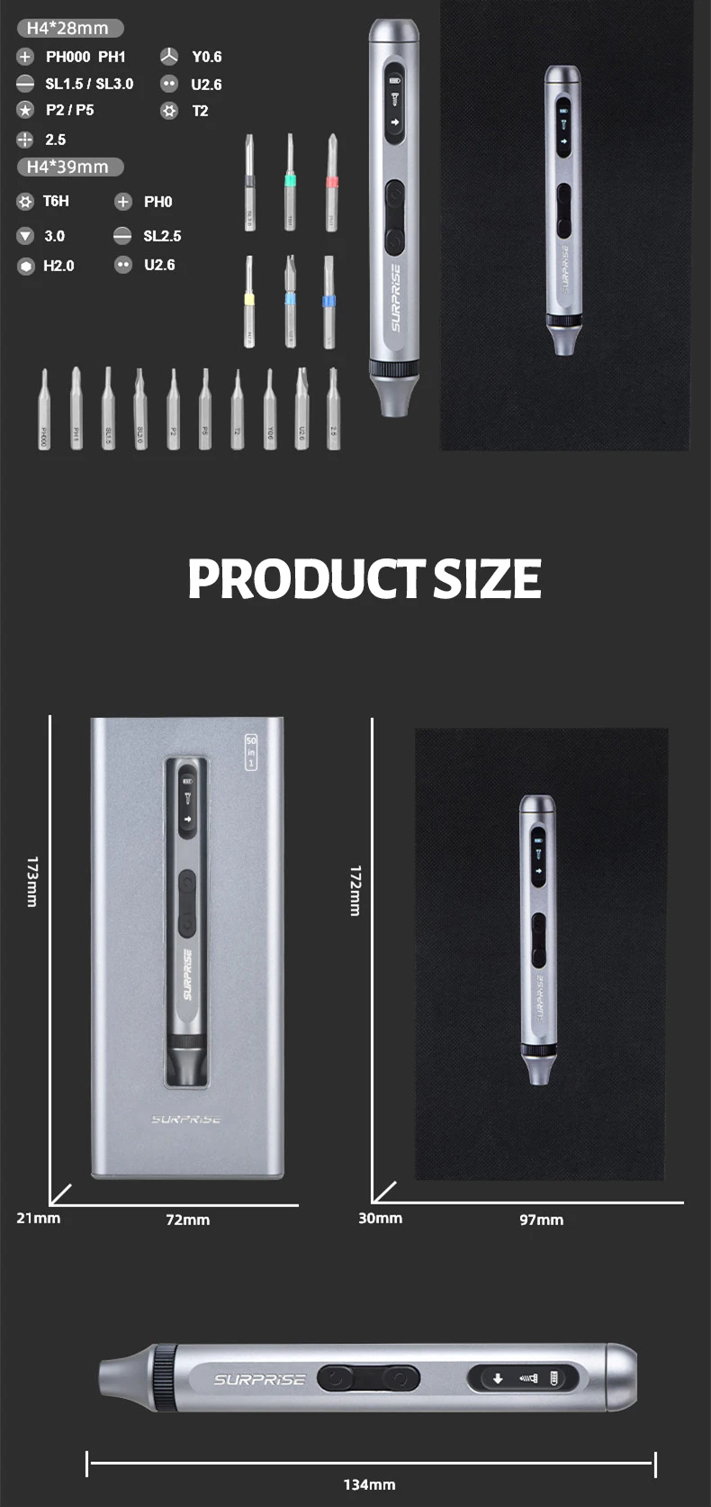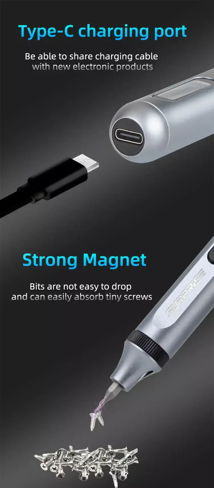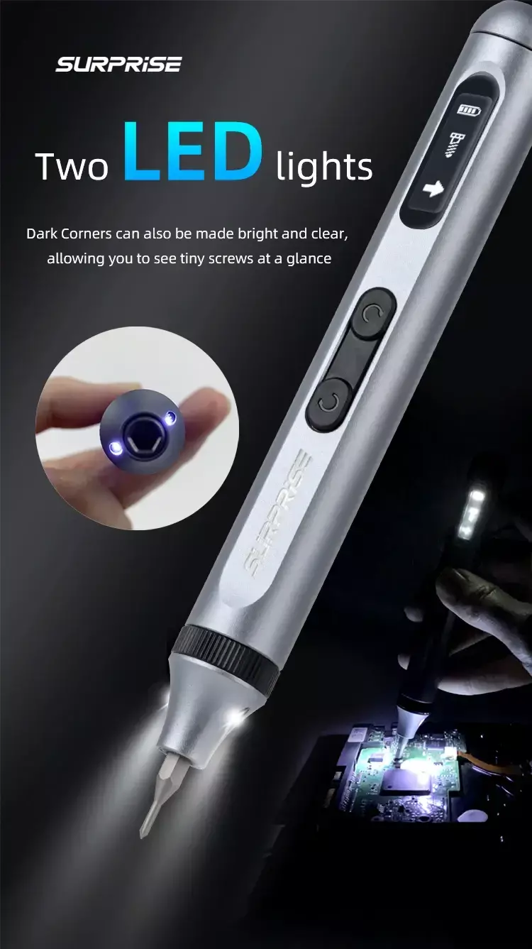 Esqueça as ferramentas comuns. Com o Surprise Precision Pro™, você realiza qualquer reparo eletrônico com rapidez e total controle. Seu motor elétrico de alta rotação e torque preciso garantem potência na medida certa, enquanto o design ergonômico de alumínio anodizado oferece conforto, firmeza e elegância em cada detalhe.