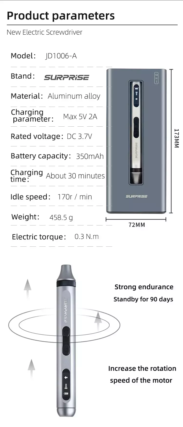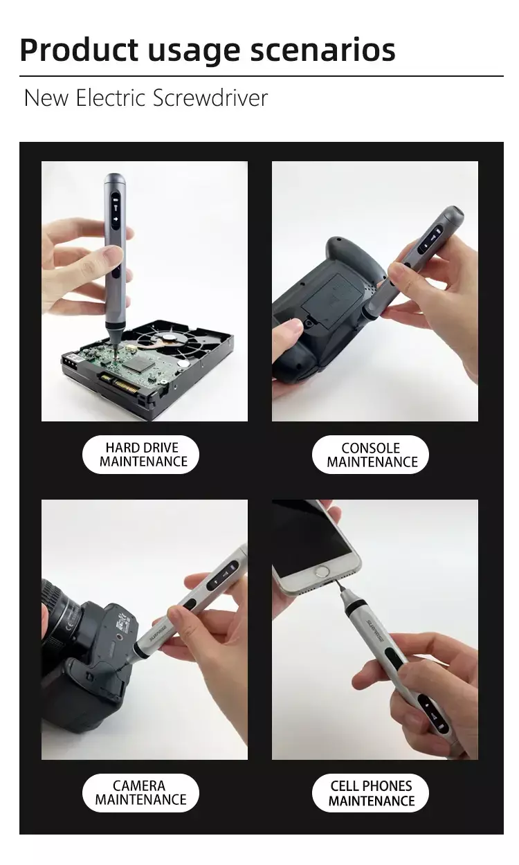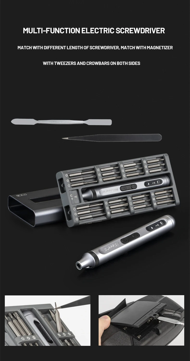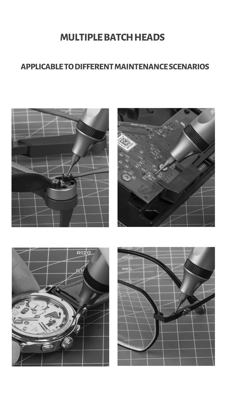 Esqueça as ferramentas comuns. Com o Surprise Precision Pro™, você realiza qualquer reparo eletrônico com rapidez e total controle. Seu motor elétrico de alta rotação e torque preciso garantem potência na medida certa, enquanto o design ergonômico de alumínio anodizado oferece conforto, firmeza e elegância em cada detalhe.