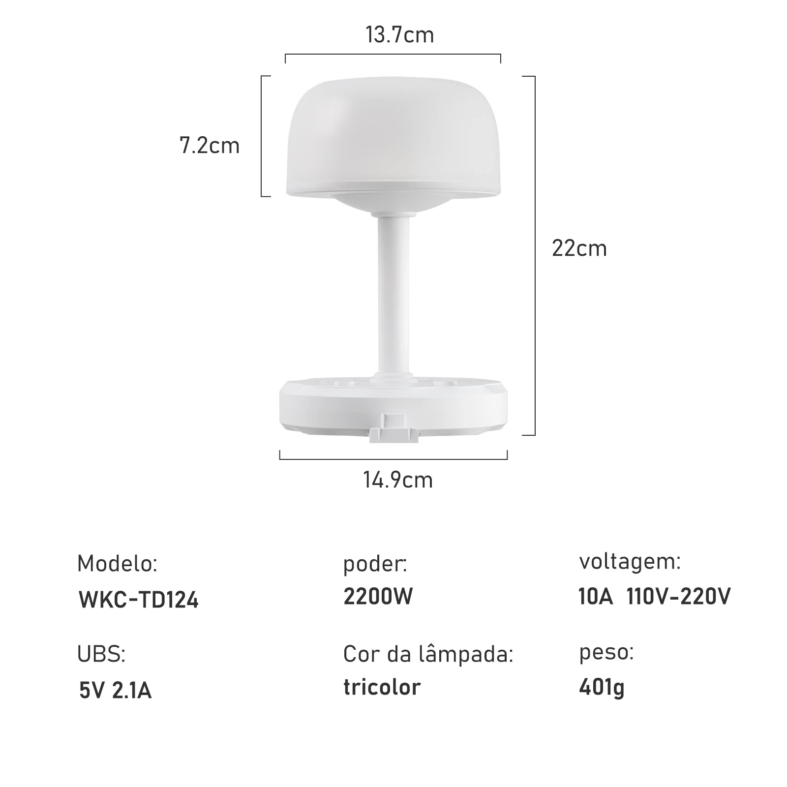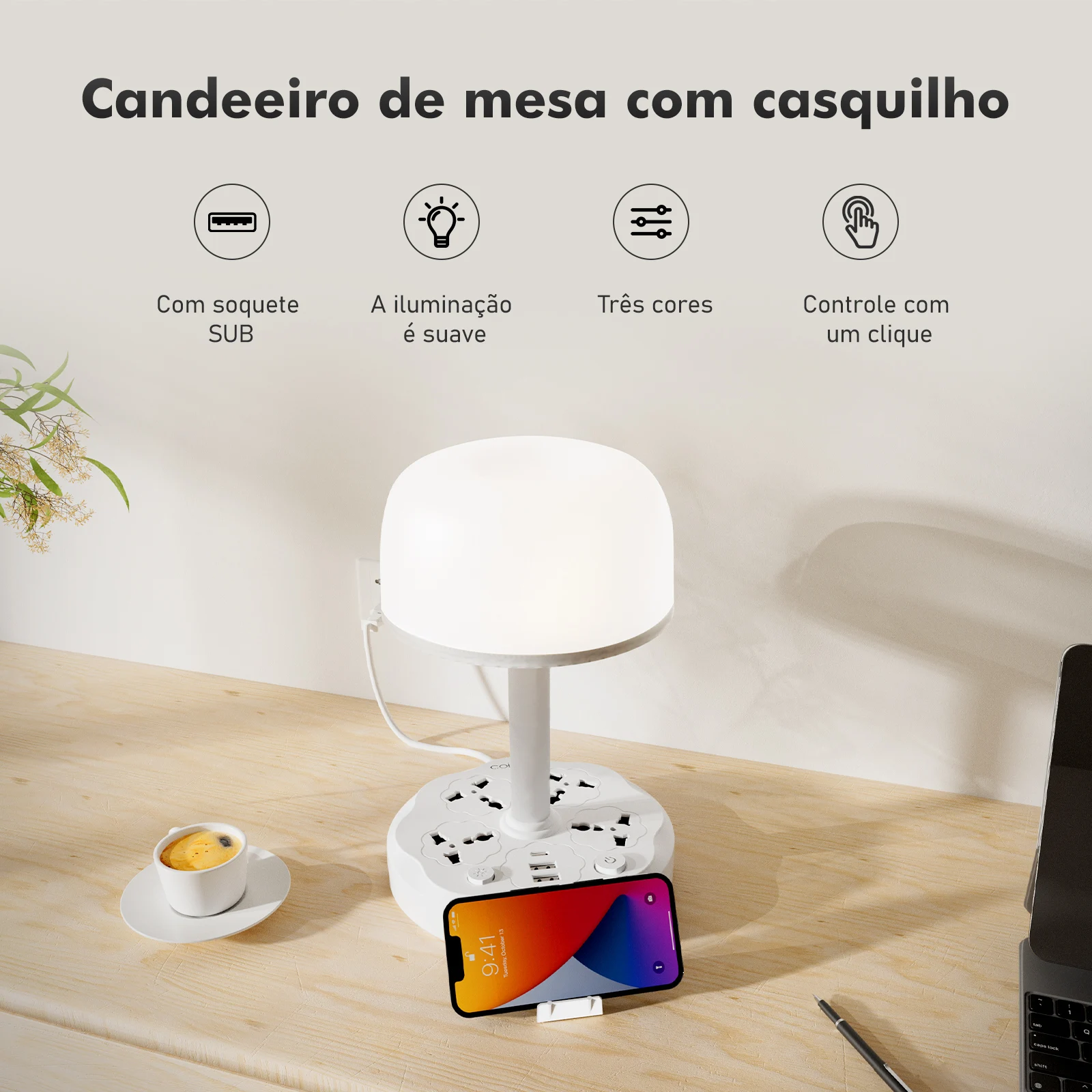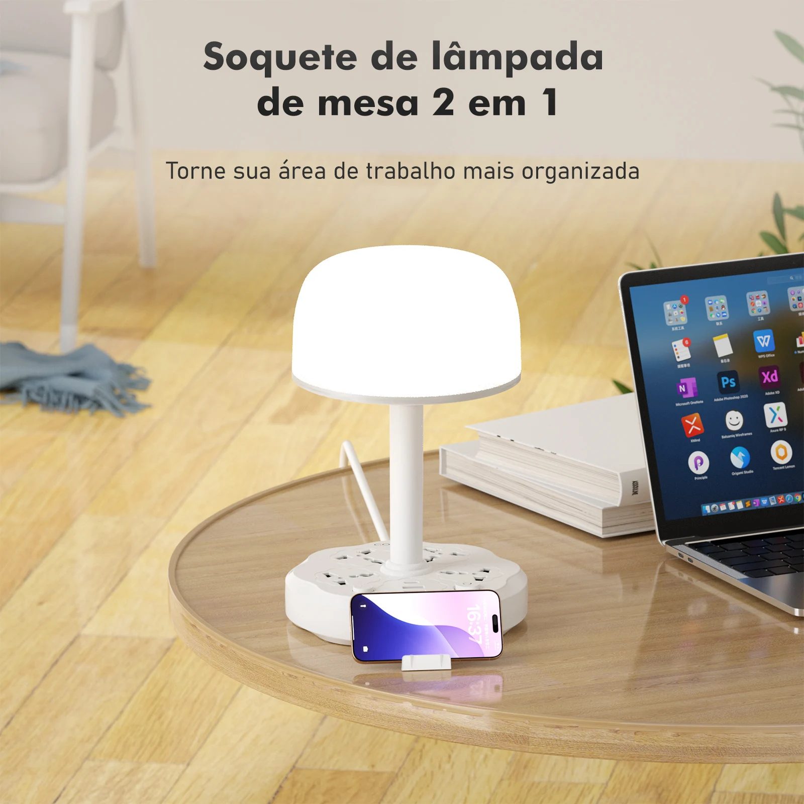 Com 3 opções de iluminação (branca, amarela e lilás claro), você personaliza o clima do seu espaço em segundos — luz branca para foco e produtividade, amarela para relaxar e lilás para um toque contemporâneo. Tudo isso com potência de 2200 W, distribuição inteligente das tomadas e portas USB integradas para carregar seus dispositivos com rapidez e segurança.